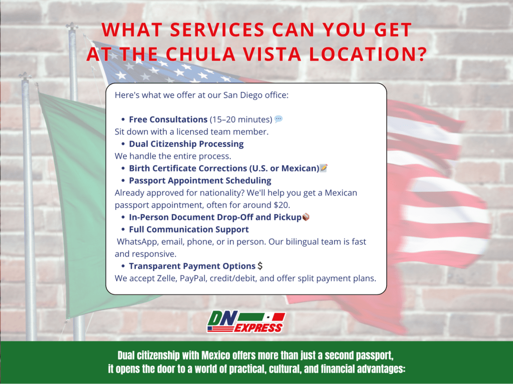 Right here. DNExpress in Chula Vista is San Diego's most trusted, attorney-led location for processing doble nacionalidad mexicana, especially for U.S.-born individuals with Mexican parents or grandparents.