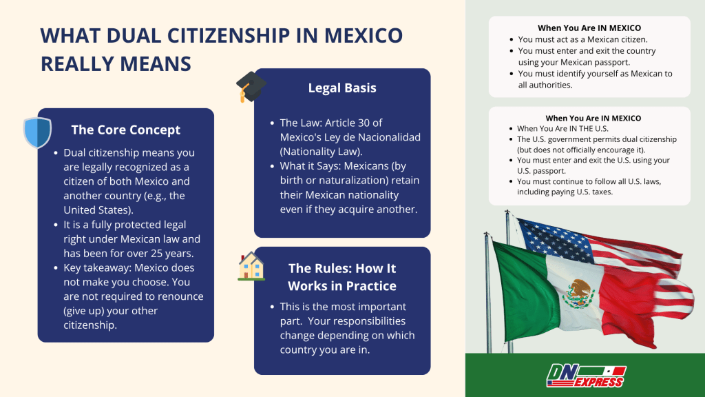 Dual citizenship in Mexico means that you are legally recognized as a Mexican national even if you also hold another country's citizenship, most commonly, American.