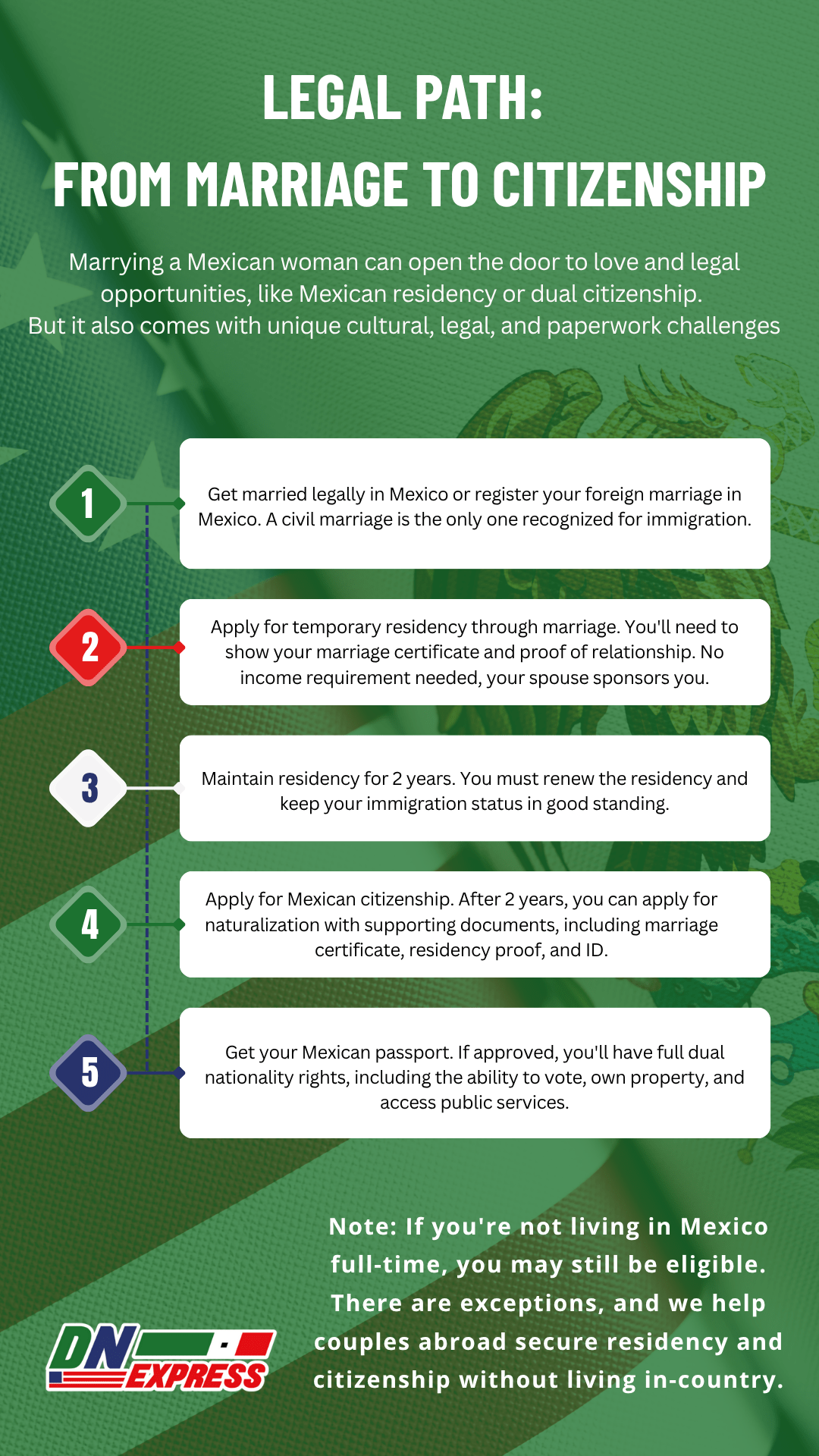 Note: If you're not living in Mexico full-time, you may still be eligible. There are exceptions, and we help couples abroad secure residency and citizenship without living in-country.