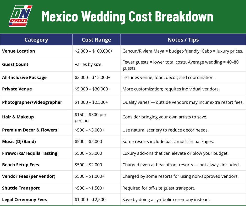 For couples going all out, think 80+ guests, professional photographers, private receptions, and multi-day events. Luxury resorts in places like Los Cabos or Riviera Nayarit can easily exceed $50,000.